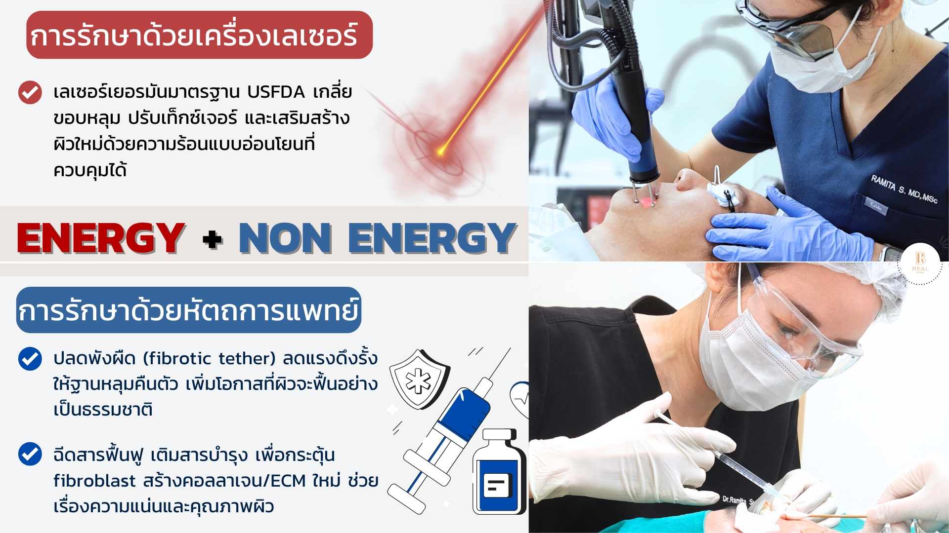เทคนิคเฉพาะของ Real Clinic ผสาน หัตถการแพทย์ และ เลเซอร์ เพื่อยกฐานหลุม เกลี่ยขอบ และกระตุ้นคอลลาเจนใหม่ในจังหวะเดียว เห็นผลไว ปลอดภัย พักสั้น อยู่ยาว