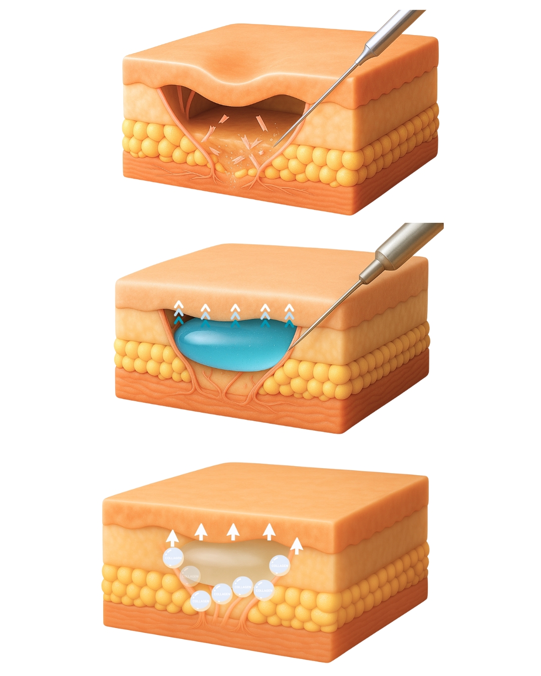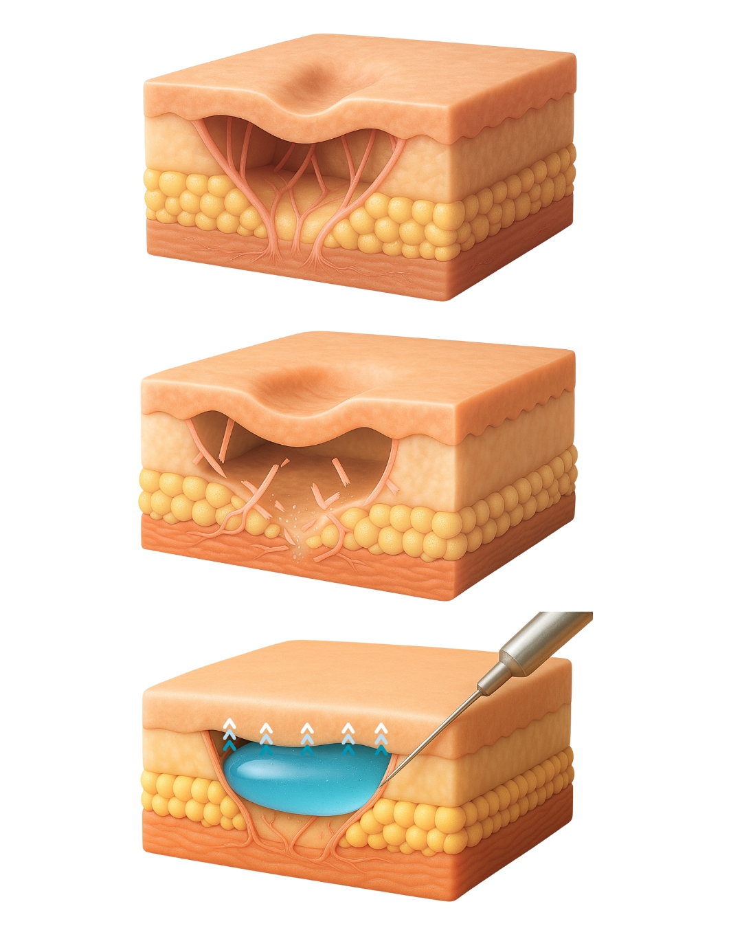 Subcision คือการปลดเชือก หรือปลดพังผืดที่ดึงรั้งฐานหลุม เมื่อปลดแล้วจะเกิดช่องว่างใต้ผิว หากปล่อยไว้มีโอกาส ยึดกลับ ในช่วงสมานแผล (2-8 สัปดาห์แรก) การเติม HA ทันทีใน plane ที่ปลดมา ทำหน้าที่: