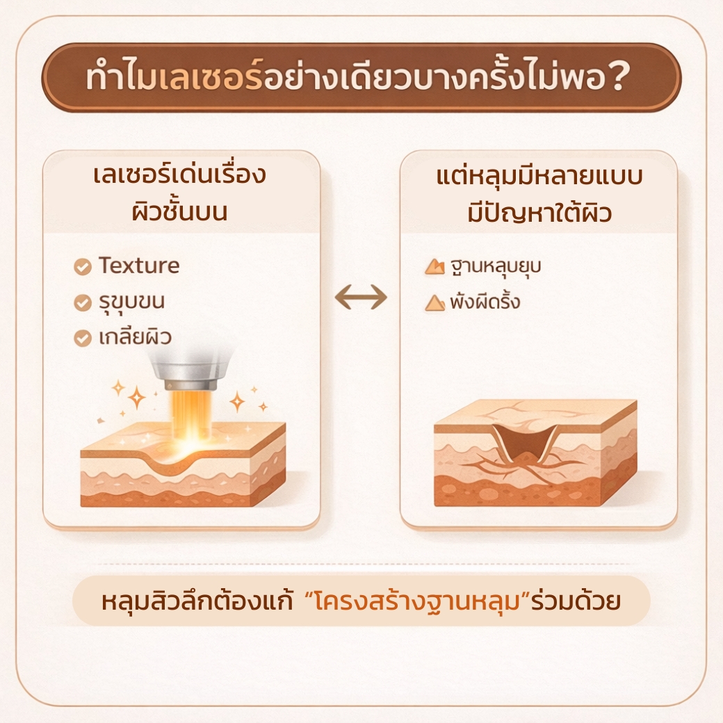 เลเซอร์เด่นในการเก็บผิวชั้นบน (texture/รูขุมขน/เกลี่ยขอบหลุม) แต่หลุมสิวหลายแบบเป็นปัญหาเชิงโครงสร้างลึก เช่น ฐานหลุมยุบหรือมีพังผืดรั้งใต้ผิว จึงอาจต้องแก้ฐานหลุมร่วมด้วยเพื่อให้ผลชัดขึ้น
