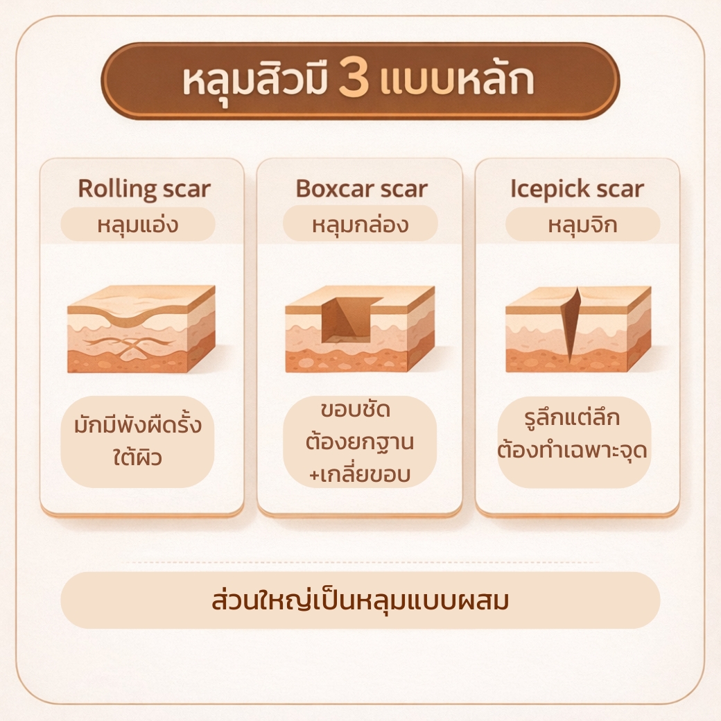 ประเด็นสำคัญ: หลุมสิวไม่ได้เป็นแค่ ผิวไม่เรียบ แต่เป็น ปัญหาเชิงโครงสร้าง ที่อาจมีทั้งชั้นหนังแท้และเนื้อเยื่อใต้ผิวเกี่ยวข้อง จึงต้องรักษาแบบ ตรงชนิดหลุม + ตรงชั้นผิว