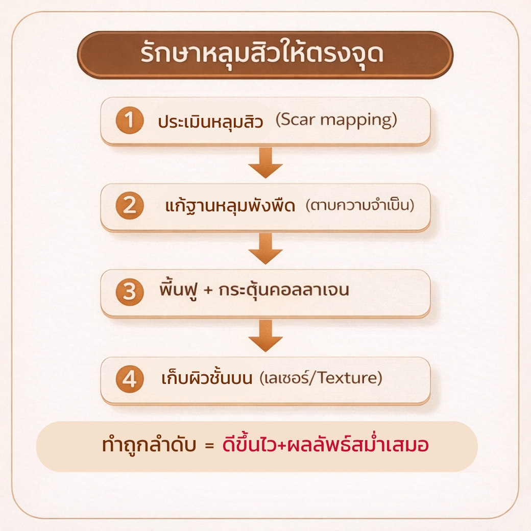 การรักษาหลุมสิวให้ได้ผล มักต้องมองเป็น 2 ชั้น: (1) โครงสร้างใต้ผิว และ (2) ผิวชั้นบน แล้วเลือกวิธีที่ ตรงชนิดหลุม และ ถูกลำดับ