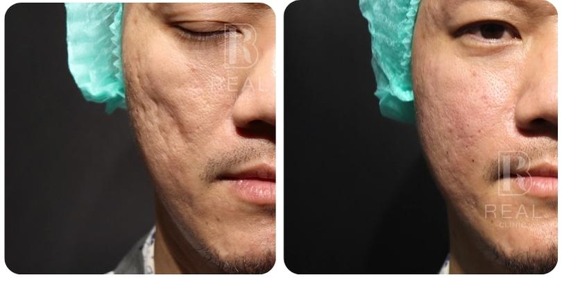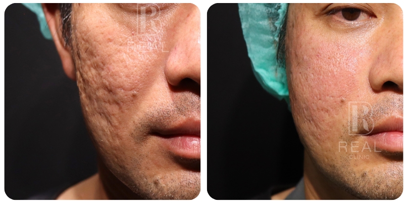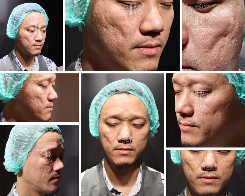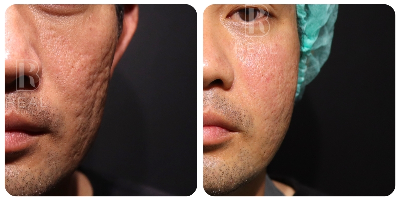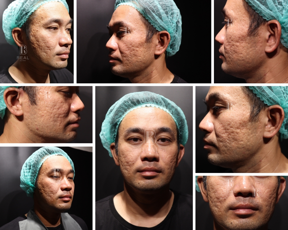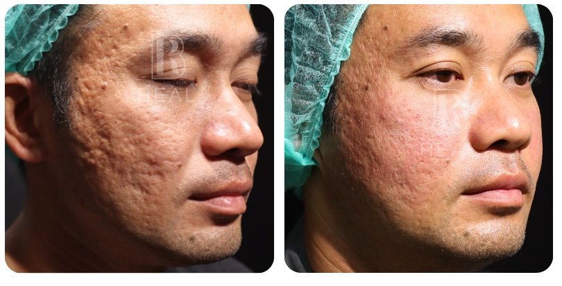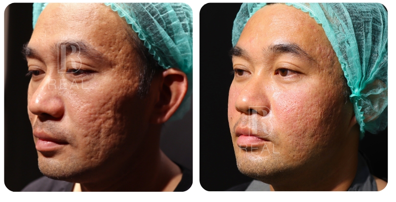 ตัวอย่างเคสนี้ เป็นผู้ชายอายุ 45 ปี มีปัญหาหลุมสิวที่เด่นชัดมากบริเวณแก้ม มานานกว่า 20 ปี เคสนี้แจ้งว่าเคยรักษาด้วยการทำ Dermapen ร่วมกับกลุ่มโกรทแฟคเตอร์ PRP ไปประมาณ 5-10 ครั้ง ที่คลินิก ร่วมกับได้รับการทำ Subcision มาแล้วด้วย รู้สึกผิวหน้าดูใสขึ้น แต่หลุมสิวก็ยังไม่ดีขึ้นมากนัก เคสนี้มีข้อจำกัดไม่สามารถหยุดพักหน้าหลังทำเลเซอร์ได้เลย จึงยังไม่เคยลองทำเลเซอร์มาก่อน