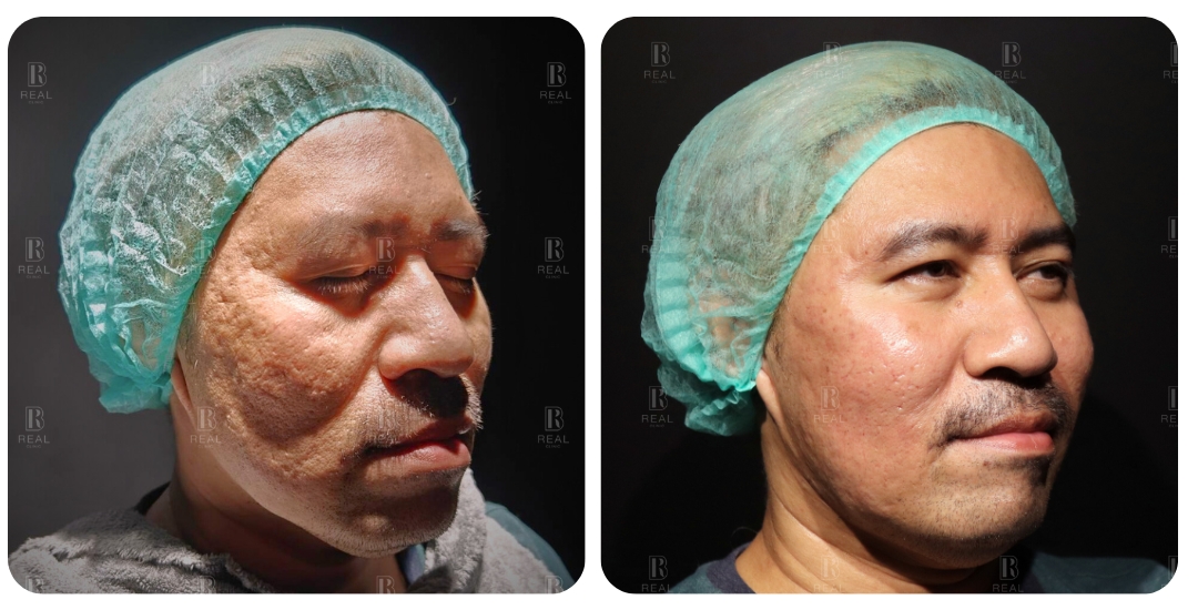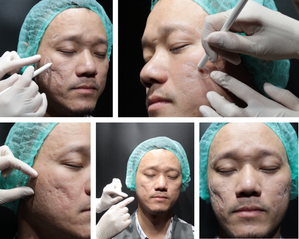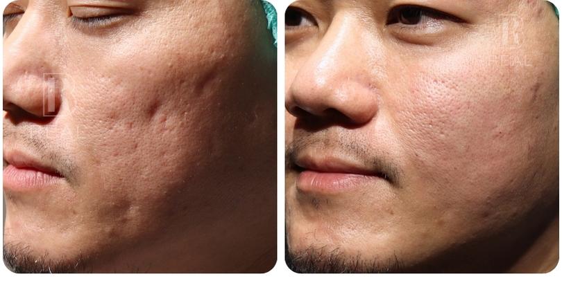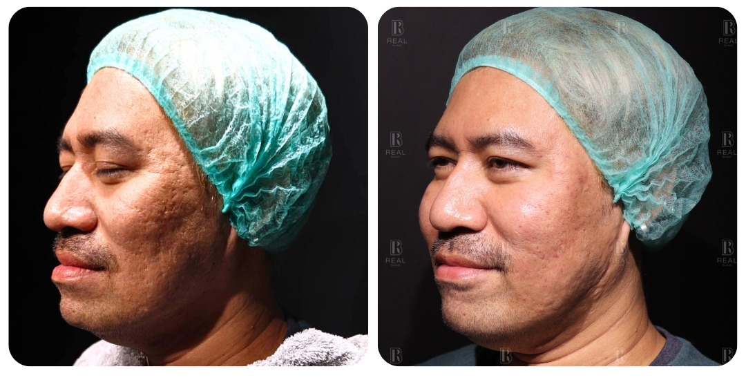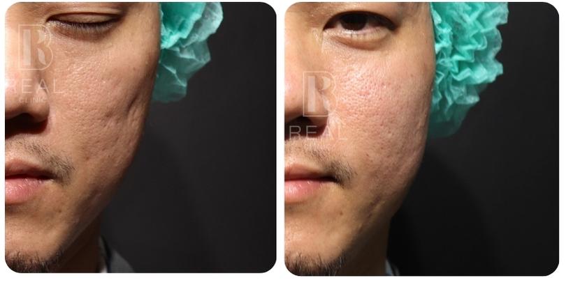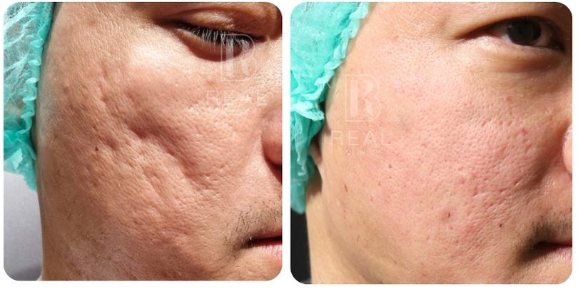 ตัวอย่างเคสนี้ เป็นผู้ชายอายุ 45 ปี มีปัญหาหลุมสิวที่เด่นชัดมากบริเวณแก้ม มานานกว่า 20 ปี เคสนี้แจ้งว่าเคยรักษาด้วยการทำ Dermapen ร่วมกับกลุ่มโกรทแฟคเตอร์ PRP ไปประมาณ 5-10 ครั้ง ที่คลินิก ร่วมกับได้รับการทำ Subcision มาแล้วด้วย รู้สึกผิวหน้าดูใสขึ้น แต่หลุมสิวก็ยังไม่ดีขึ้นมากนัก เคสนี้มีข้อจำกัดไม่สามารถหยุดพักหน้าหลังทำเลเซอร์ได้เลย จึงยังไม่เคยลองทำเลเซอร์มาก่อน